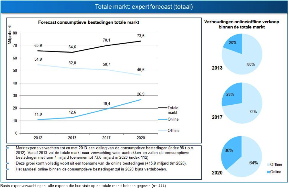 Consumptieve bestedingen zullen na 2013 weer aantrekken dankzij online verkopen. Naar verwachting groeit de totale B2C-verkoop van producten en diensten van 65,9 miljard in 2012 naar 70,1 miljard euro in 2017 (+6%) en naar 73,6 miljard euro (+12%) in 2020. De versmelting van online en offline verkoopkanalen is de toekomst van de retail. Het online aandeel van alle B2C-verkopen via smartphone, tablets, etcetera is dé grote aanjager voor de toenemende consumptieve bestedingen, thuis en in de winkel. Dat blijkt uit expertonderzoek van GfK in opdracht van het onderzoeksprogramma Shopping2020.