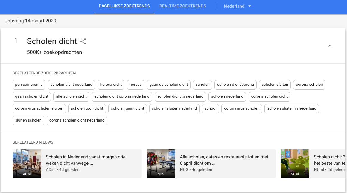 Na enkele dagen volgde op zondag de aankondiging dat scholen zouden sluiten tot 6 april. Direct schoot het zoekvolume wat betreft software voor thuisscholing omhoog. Waar studenten zich normaal in deze periode bezighouden met de inschrijving voor een nieuwe opleiding, vroegen ze zich nu af of ze nog naar hun stageplek konden of examens konden doen.