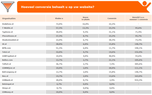 GSMTopdeal staat bovenaan de conversielijst met een percentage van 40 procent. Door 10 procent (15) van de respondenten gevonden en door zes mensen op nummer één gezet. Als we alleen even kijken naar de conversiepercentages van de grote bedrijven, dan zien we dat Vodafone precies drie keer zoveel conversie draait tijdens het onderzoek dan Telfort. En vergelijken we de nummer één in dit onderzoek met KPN, dan zien we dat het conversiepercentage dubbel zoveel is.