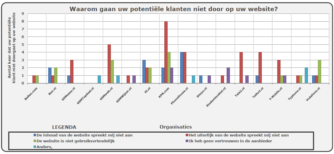 Op de website van KPN haken veel consumenten af vanwege het design en de vormgeving van de website. KPN heeft ook een hoog totaal aan afhakers (16 van de 77). Een van de respondenten geeft als tip dat er minimaal eens gekeken kan worden naar het gebruikte lettertype: “in ieder geval het front van de homepage aanpassen”. Een ander raakt verdwaalt en vindt de hoeveelheid informatie en keuzemogelijkheden overvloedig: