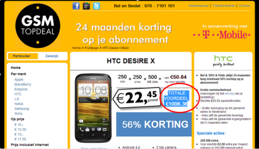 Verder is GSMtopdeal duidelijk een stunter, tenminste; als we kijken naar de website. Met oudere modellen (de HTC Desire is echt al een paar jaar op de markt inmiddels) lijkt de site bijzonder voordelig. Over diezelfde Desire wordt gesteld dat als je nu een abonnement afsluit voor 22,45 per maand, je het “TOTALE VOORDEEL van €1006.36” in de wacht sleept. Hoewel een verouderde smartphone; dit is natuurlijk niet verkeerd en dit spreekt een heleboel mensen aan.
