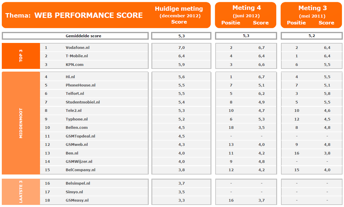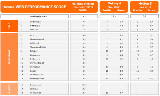 De hoogste nieuwe binnenkomer in dit onderzoek was GSMtopdeal, al sinds 2007 bezig en tegenwoordig (of al langer) samenwerkend met T-Mobile wat de site direct een wat minder onafhankelijk tintje geeft.