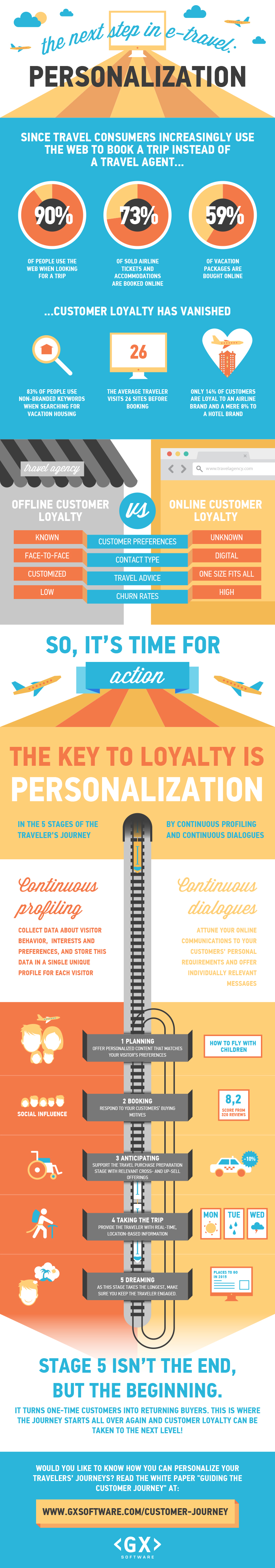 Waar mensen een persoonlijke service eisen van het reisbureau, verwachten zij die ook op het web. Door het personaliseren van online kanalen, wordt aan die verwachting tegemoet gekomen. Daarmee is personalisatie dus een heel waardevol instrument om klanten aan een merk te binden. Als een organisatie bezoekers tijdens alle fases van het reisproces online optimaal van dienst is, zullen zij hun volgende reis graag weer bij diezelfde partij boeken.