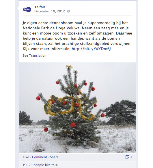 Telfort pakt dit slim aan door op Facebook alle content te hangen onder een van de kernwaarden: supervoordelig. Alle posts hebben betrekking op het dagelijkse leven en het voordeel dat behaald kan worden, bijv. bij de koop van een kerstboom.