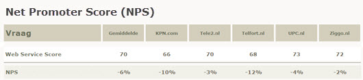Dit contrast is ook terug te zien in de verschillen tussen de Net Promoter Scores (NPS). De NPS wordt berekend door respondenten te vragen of ze een organisatie zouden aanraden aan anderen. Een positieve NPS wordt als goed beschouwd. Zoals hieronder te zien is, weet echter geen van de websites in de telecombranche op een Net Promoter Score boven de 0% te eindigen. Netto wordt dus geen van deze websites aanbevolen aan vrienden of familie.