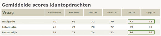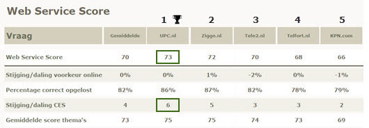 Duizend respondenten werden naar de websites van hun telecomaanbieder gestuurd met een zestal klantopdrachten (onderaan beschreven). Op de website van UPC werden deze in 86 procent van de gevallen correct opgelost. Vooral vergeten wachtwoorden, informatie over de factuur en hulp bij een verhuizing blijken eenvoudig te achterhalen op UPC.nl. Bij alle klantopdrachten hebben de respondenten op UPC.nl minder moeite met de oplossing dan vooraf gedacht, zo blijkt uit de gemeten Customer Effort Score (CES) voor en na het uitvoeren van de klantopdracht. UPC komt mede daardoor als winnaar uit de bus in de Web Service Scan van WUA!.