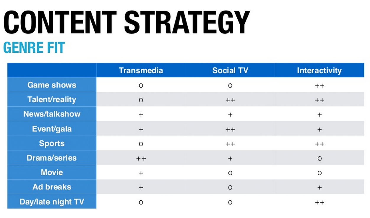 - Social tv: ongestructureerd, het gaat hier vooral om de conversatie. Het heeft min of meer altijd dezelfde mogelijkheden, bijvoorbeeld Twitter.