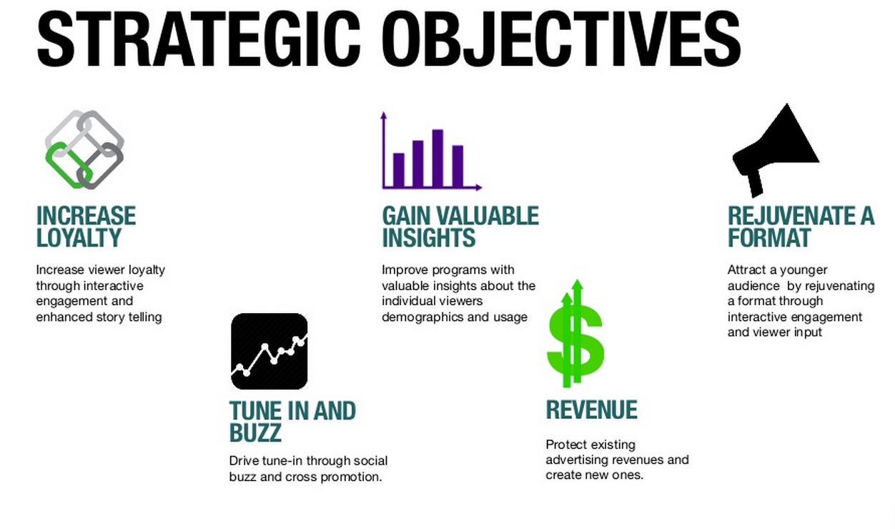 - Second screen: hierbij gaat het erom dat je op een georaganiseerde, gestructureerde manier engagement creëert met wat er op dat moment op tv getoond wordt.