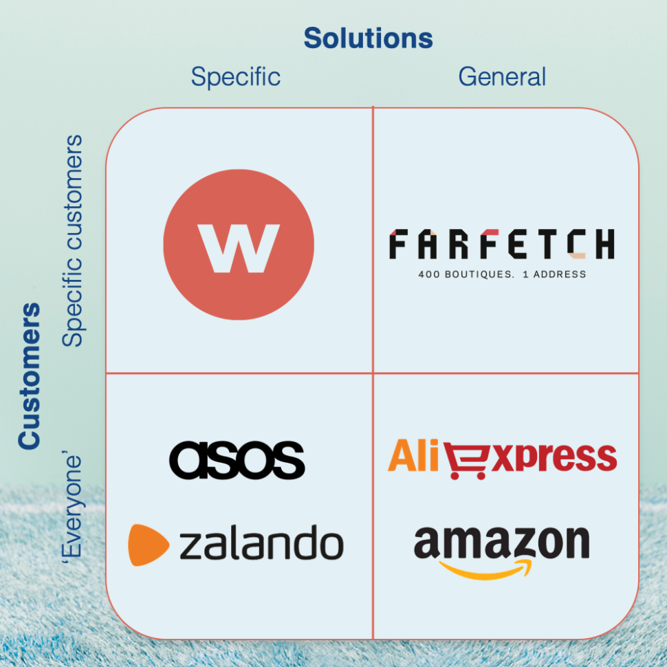 Hoe je meedoet, schetst Coelewij aan de hand van vier kwadranten: als ondernemer moet je kiezen of je specifieke danwel generieke oplossingen aanbiedt en of je dat doet voor iedereen of voor specifieke doelgroepen. Amazon en AliExpress zijn natuurlijk twee allemansvrienden, maar als kleine speler kun je beter specifieker inzetten. “Om de concurrentie aan te kunnen gaan, moet je bovendien een eigen netwerkeffect creëren. Bij Wehkamp lukte dat onder meer door onze marketplace uit te breiden met de elektronica van BCC.”