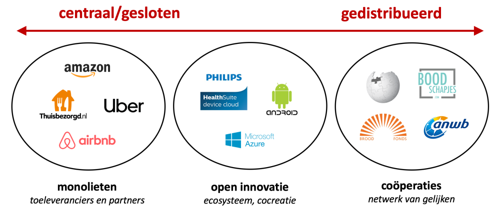 Er is een onderscheid tussen soorten platforms, waarbij de gesloten ‘monolieten’ zoals Amazon en Bol.com natuurlijk het meest bekend zijn. Daar tegenover staan de gedistribueerde platforms, die je ook wel coöperaties kunt noemen. ‘Open innovatie’ zou je een tussenvorm kunnen noemen. Het grote verschil met die minder bekende alternatieven is dat partijen daar opereren als een netwerk van gelijken, met alle voor- én nadelen van dien. Hoewel de ‘centrale’ platformen natuurlijk het bekendst zijn, kun je volgens Kreijveld niet stellen dat ze per definitie altijd het meest succesvol zullen zijn. Dit zijn bemoedigende woorden voor partijen die de ambitie hebben om de grote spelers te weerstaan en hun eigen marktplaats op te tuigen.