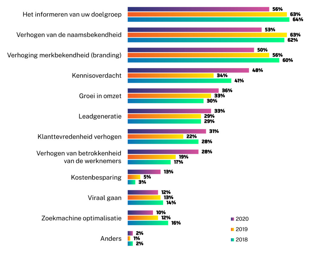 Als we kijken naar welke doelen marketeers stellen, dan zijn het informeren van de doelgroep (56 procent), verhogen van de naamsbekendheid (53 procent) en verhoging van de merkbekendheid (50 procent) nog steeds de belangrijkste doelen van online video.