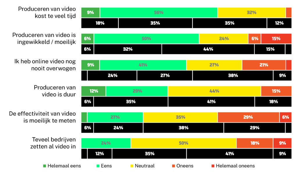 Het relatief kleine deel dat aangeeft geen online video in te zetten, zegt dat het produceren ingewikkeld is en te veel tijd kost. Beide argumenten worden nog vaker genoemd dan in 2019 (respectievelijk 38 procent naar 56 procent en 53 procent naar 65 procent).