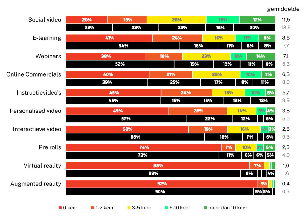 Ondanks de afname ten opzichte van 2019, gebruikte 80 procent van de marketeers online video voor social media, dat daarmee de meest gebruikte vorm is van video. Daarnaast is er een opmars te zien bij e-learning en webinars. Vorig jaar zei 27 procent van de marketeers dat ze minstens drie keer online video hebben ingezet voor e-learning, dit jaar was dat 35 procent. Bij webinars zien we een stijging van 30 naar 45 procent. Niet zo gek aangezien iedereen door de coronacrisis nog meer aan zijn of haar beeldscherm zit gekluisterd en we elkaar alleen nog maar in het digitale kantoor ontmoeten.