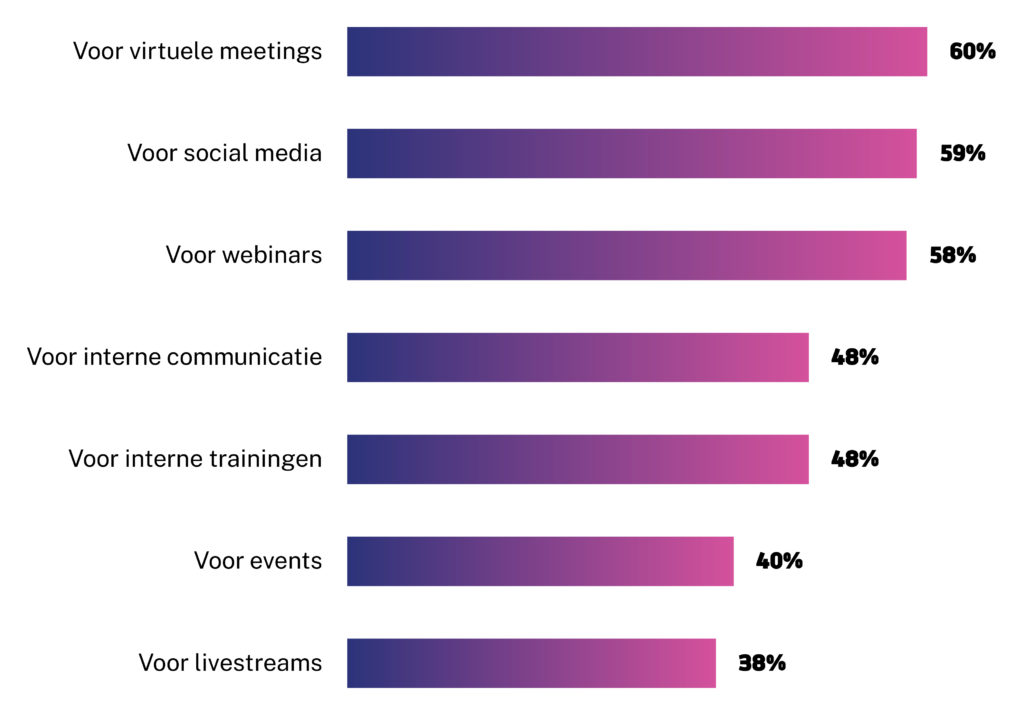 Organisaties gebruiken online video niet voor één communicatiekanaal of medium, maar verspreiden het gebruik enorm. Video was noodzakelijk voor virtuele meetings (60 procent), verrijkte social media (59 procent) en maakte webinars mogelijk (58 procent). Maar ook het gebruik van online video voor interne doeleinden is substantieel (interne communicatie 48 procent en interne trainingen 48 procent).