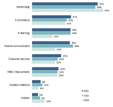 Hoe zijn de doelstellingen voor de video’s dan verdeeld? Online video wordt net zoals voorgaande jaren voor verschillende doeleinden ingezet. Advertenties maken na een dip in 2020 een kleine comeback: 61 procent van de marketeers gebruikt video hiervoor. E-commerce (37%) is qua inzet de grootste stijger, e-learning (36%) blijft gelijk, vergeleken met 2020. Marketeers zetten online video alleen minder in voor interne communicatie: die inzet gaat van 38 procent in 2020 naar 36 procent voor het afgelopen jaar.