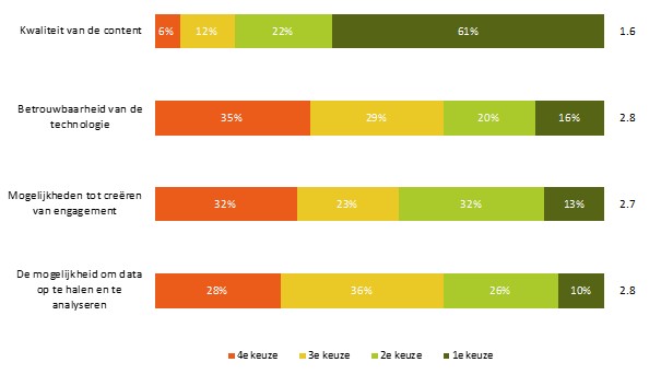 Bij het maken van online video’s letten marketeers het meest op de kwaliteit van de content. Bijna tweederde (61%) van de marketeers geeft dit aan. Onder kwaliteit verstaan we de technologie achter online video, de inhoud (goede ‘show’) en de mate van hulp bij het opzetten van een live event/video. Minder marketeers letten op de betrouwbaarheid van de technologie (35%), de mogelijkheden tot creëren van betrokkenheid (32%) en de mogelijkheid om data op te halen en te analyseren (28%).