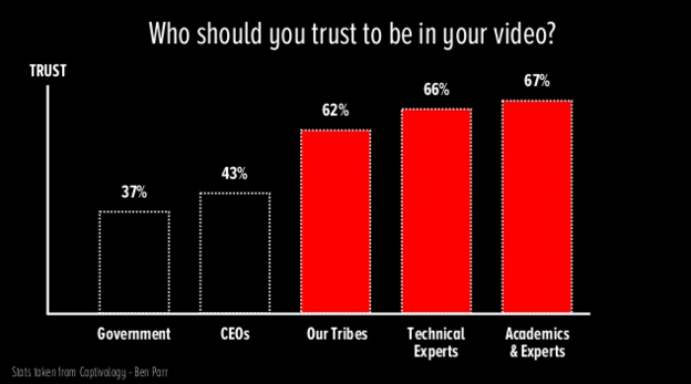 Bij leadgeneratie video’s zijn er vaak een of meerdere personen die jouw verhaal vertellen. Je kunt er voor kiezen om een animatievideo te gebruiken, alleen dat spreekt net iets minder tot de verbeelding. Het gebruik van personen levert meer vertrouwen op en dat is wat we nodig hebben om leads te genereren. Volgens Ben Parr is het vooral interessant om experts aan het woord te laten.