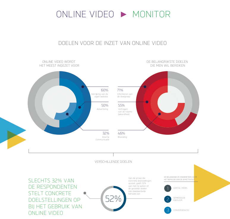 Maar liefst 72 procent van de ondervraagden zet online video inmiddels in binnen de marketingmix. Waarom ze dat doen, weten ze nog lang niet altijd. Slechts een op de drie stelt concrete doelstellingen op voor online video. En van de groep die wel doelstellingen bepaalt, weet slechts de helft of deze doelstellingen ook daadwerkelijk worden gehaald.