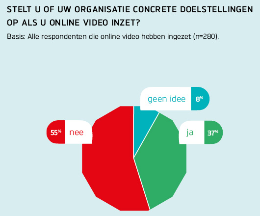Nog altijd weet meer dan de helft van de marketeers niet precies waarom ze online video inzetten, maar dat is gelukkig iets minder dan een jaar geleden. De effectiviteit van online video wordt overigens nog steeds met name gemeten aan de hand van het aantal views en unieke kijkers. Wat dit jaar wel extra opvalt is dat internationaal acterende bedrijven vaker concrete doelstellingen stellen dan bedrijven die alleen nationaal actief zijn.