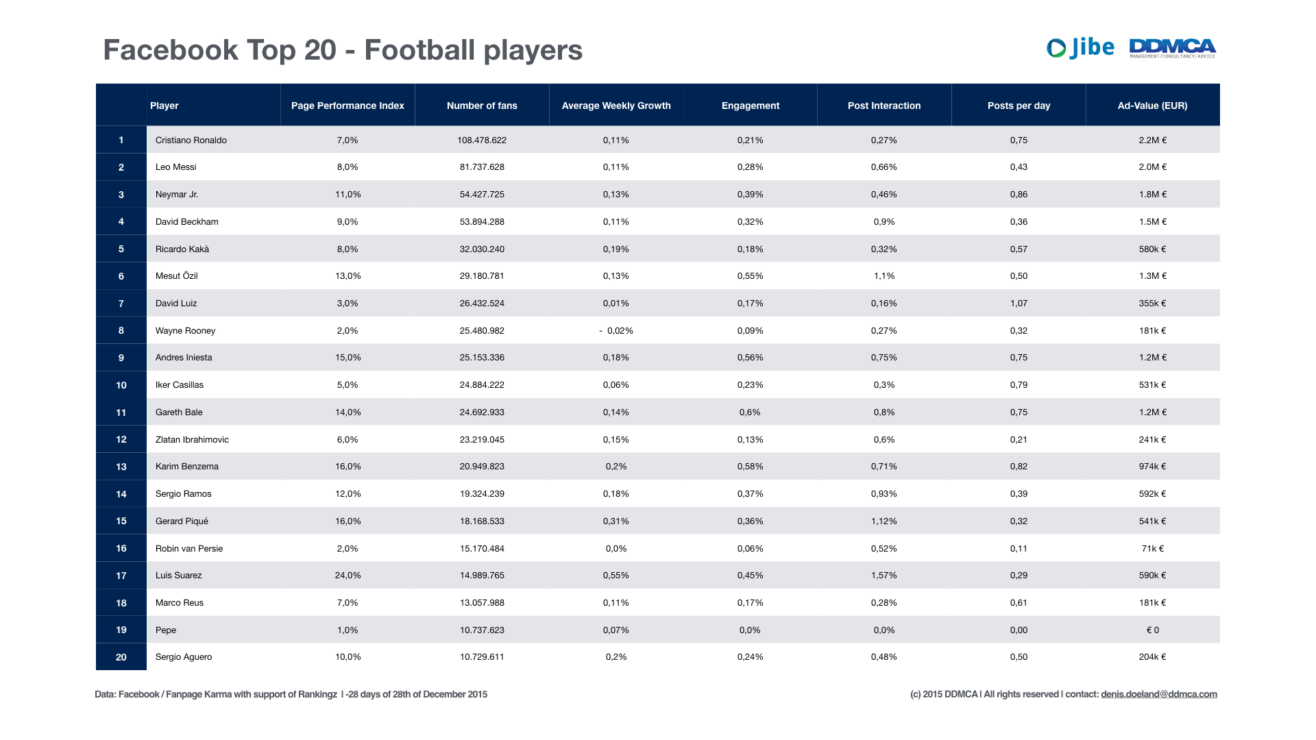 Overzicht van voetballers met grootste aantal Facebook-fans. Zie de totale lijst hier (één keer per maand geüpdatet).