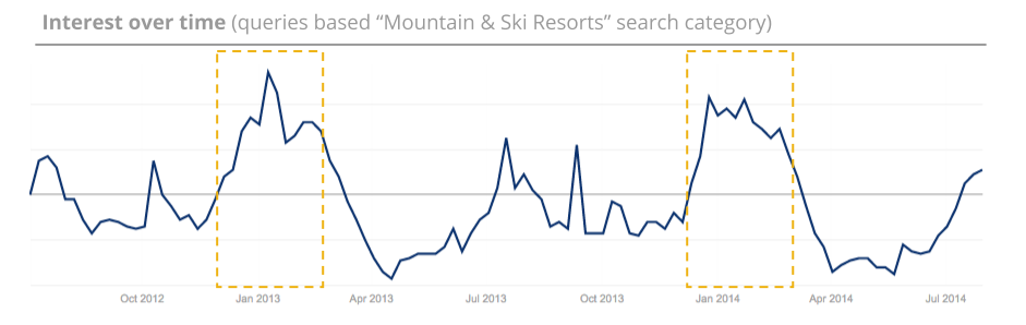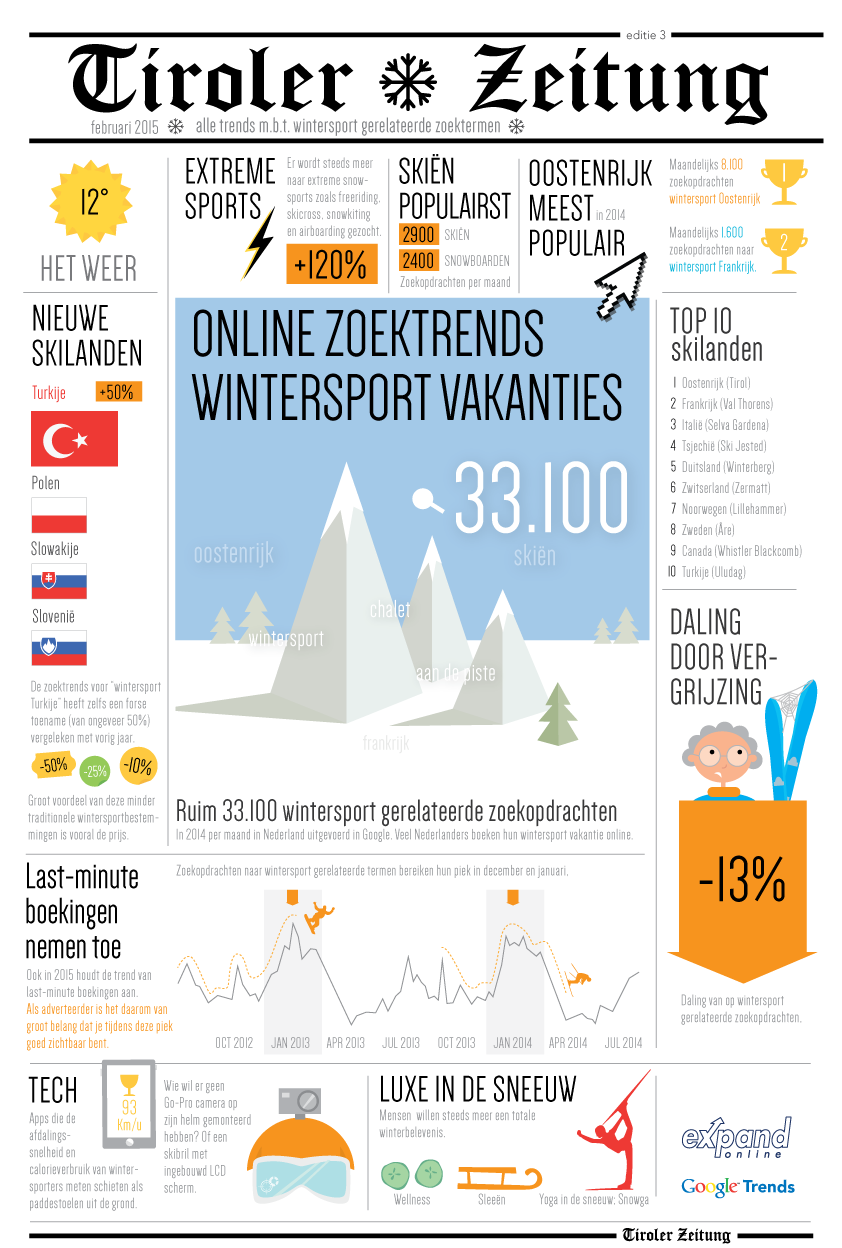 Zoekopdrachten naar wintersportgerelateerde termen bereiken hun piek in december en januari, ook in 2015 houdt de trend van last-minute boekingen aan. Door de aanhoudende crisis zullen mensen steeds korter van te voren een wintersportvakantie boeken. Als adverteerder is het daarom van groot belang dat je tijdens deze piek goed zichtbaar bent.