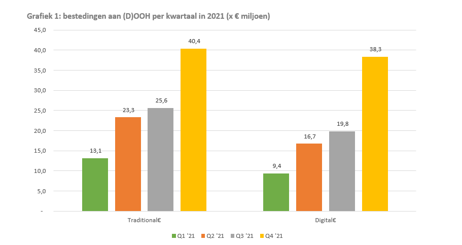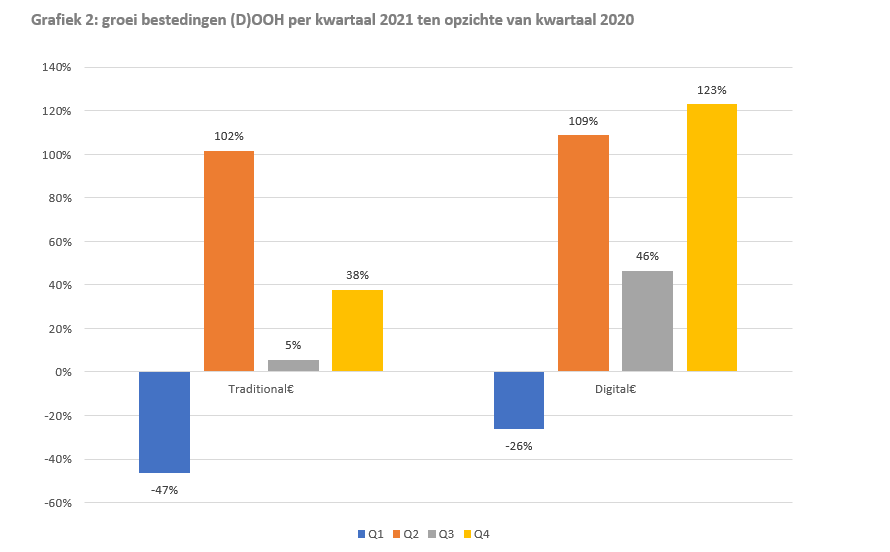 Ondanks de diverse lockdownperiodes in 2021 en andere maatregelen als gevolg van corona nam de omzet elk kwartaal toe ten opzichte van het kwartaal ervoor. Dit geldt zowel voor de traditionele vormen van OOH als voor DOOH. Het tweede en vierde kwartaal lieten in termen van groei de beste cijfers zien. Het tweede kwartaal was goed voor 105% groei ten opzichte van hetzelfde kwartaal in 2020, in het vierde kwartaal werd een plus van 69% genoteerd.