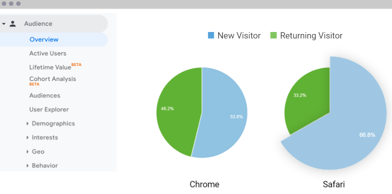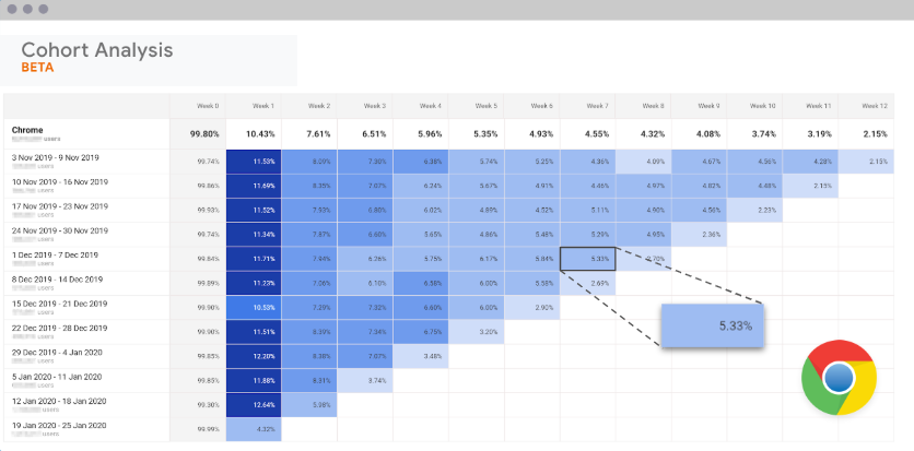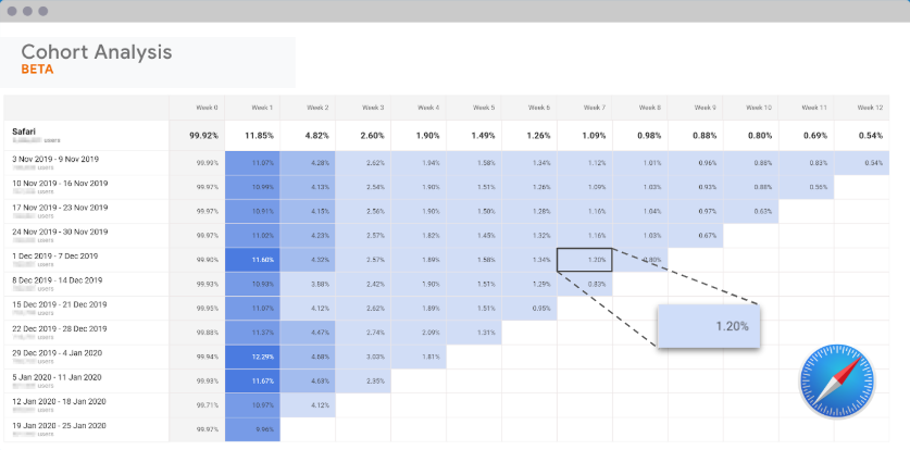 Speelt dit probleem bij jou? Dat is simpel te controleren. Vergelijk de cohorten van Safari-gebruikers met die van Chrome-gebruikers. Als de verschillen groot zijn, dien je actie te ondernemen. Zie hieronder een voorbeeld. Eerst een Chrome-cohort.