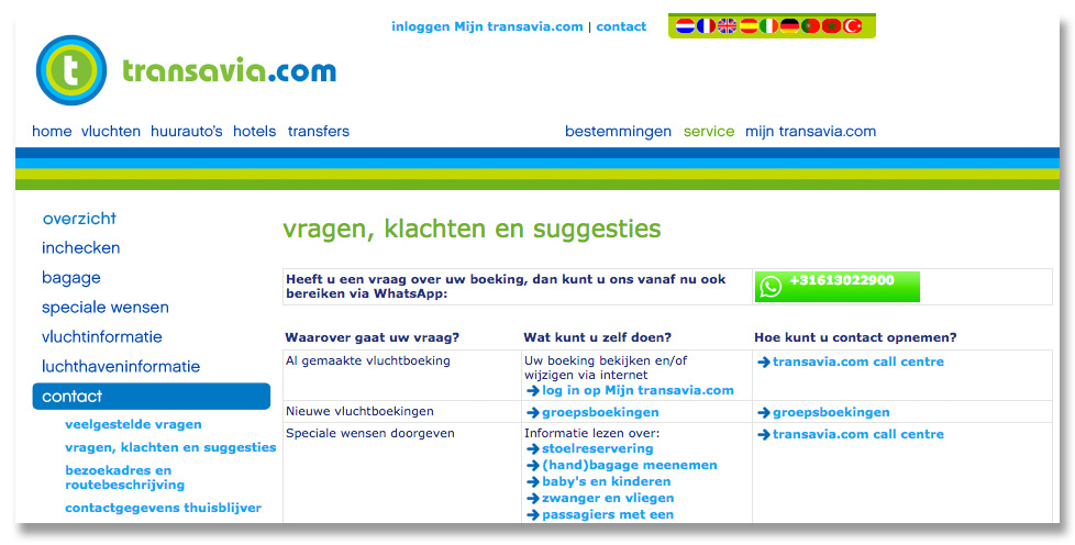 Wat op de website direct opvalt, is dat het nummer voor de WhatsApp-service, in tegenstelling tot bijvoorbeeld KLM of Coolblue, op de contactpagina direct bovenaan staat. Transavia gaat er dus voor! Althans, tot op zekere hoogte.
