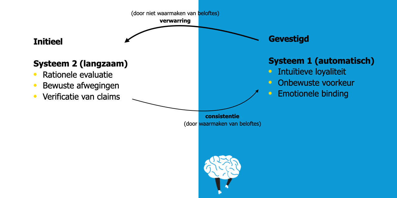 Het brein, zo herinnert Kahneman ons, werkt in twee systemen. Systeem 2 is langzaam, bewust, evaluerend. Dat is waar een nieuwe klant je merk voor het eerst tegenkomt en een bewuste afweging maakt. Systeem 1 is automatisch, intuïtief, emotioneel. Dat is waar een loyale klant zonder nadenken voor je kiest, je verdedigt zonder gevraagd te zijn en je aanbeveelt uit eigen beweging. De afstand tussen die twee toestanden meet je niet in ontwerpiteraties. Je meet hem in nagekomen beloftes.