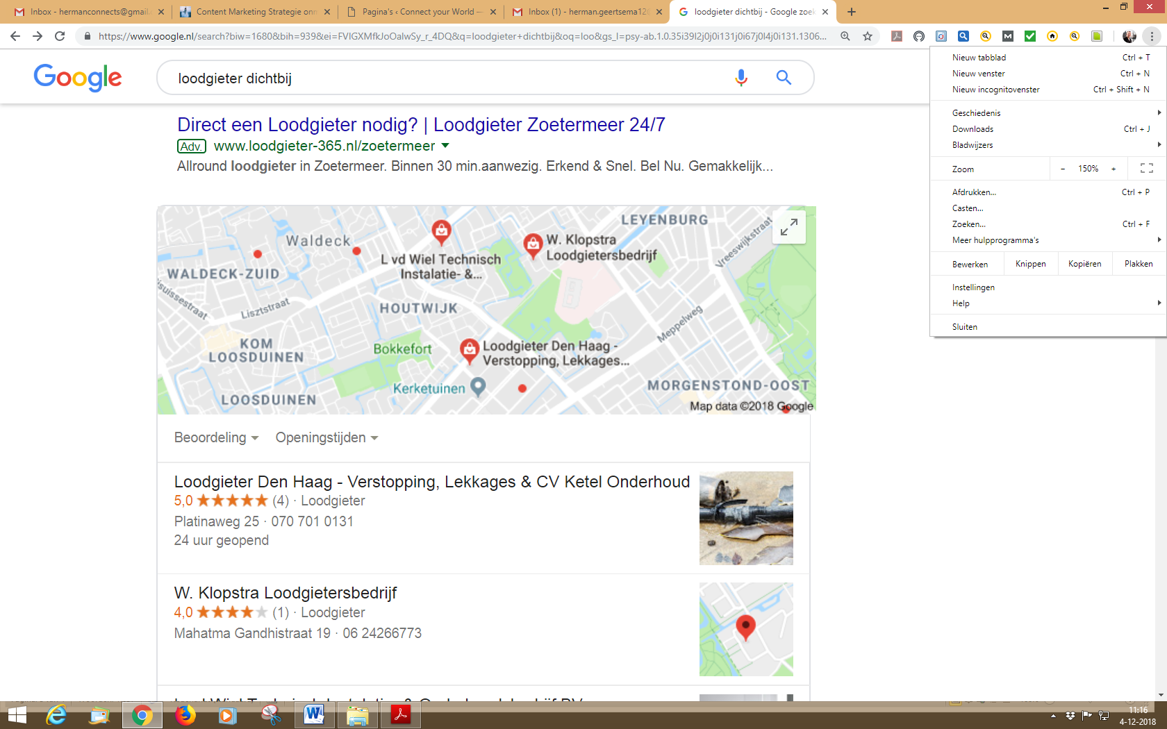 Als er veel loodgieters zijn in een bepaalde stad, dan kan inzetten op SEO een loodgieter een stevig concurrentievoordeel opleveren. Bij een snelle telling kwam ik al uit op meer dan honderd loodgieters in Den Haag. Zoals bekend is de eerste positie of eerste pagina in Google noodzakelijk voor een aanzienlijk aantal online klanten. Sta je op de tweede pagina, dan scoor je onherroepelijk minder. Met honderd concurrenten is er dus wat werk aan de winkel.