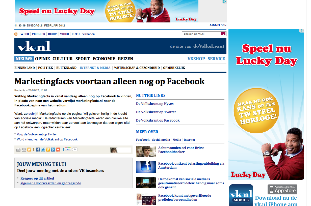 In de 9 jaar Marketingfacts heb ik nooit geschroomd om mijn mening intern te geven over artikelen, banners of technische wijzigingen, soms tot enige ergenis van de betrokken personen. Het heeft mij intern herhaaldelijk de veelzeggende titel “zeikerd” opgeleverd, wat ik (volgens de crew) kan beschouwen als een eretitel; waardering voor het (vaak middels pittig mailtjes) op het juiste moment weer even op scherp zetten van de boel. Een mooie rol die mij aardig op het lijf is geschreven, naast het sleutelen aan de site voor nieuwe functionaliteiten.