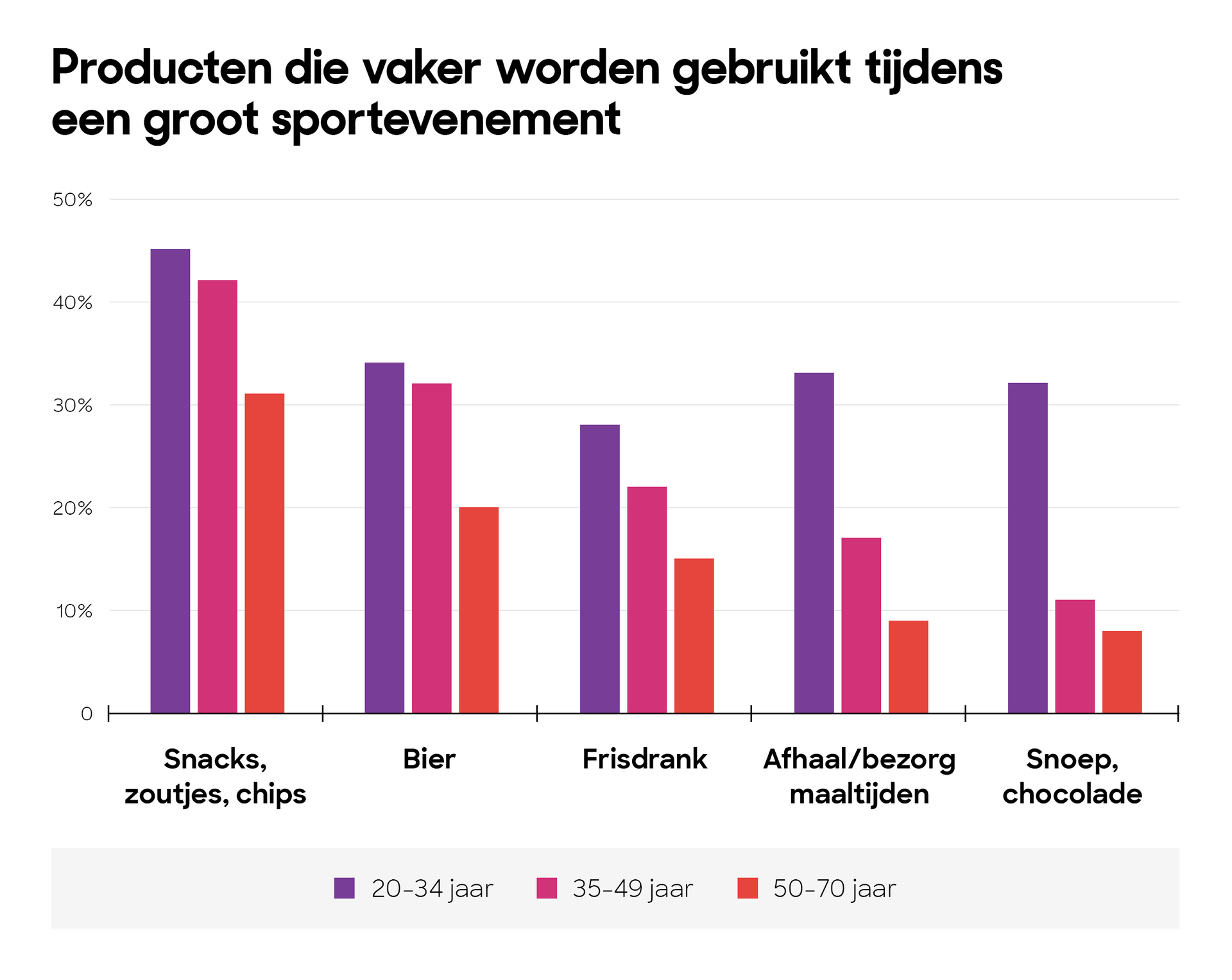 Tijdens een groot of speciaal sportevenement past meer dan de helft van de Nederlanders hun eetgedrag aan waarbij de consumptie van snacks, bier en frisdrank flink toeneemt – vooral onder jongeren. Daarnaast overweegt een aanzienlijk deel van de respondenten om bepaalde producten aan te schaffen ter voorbereiding op de sportzomer, zoals een nieuwe televisie (14%), een nieuw internetabonnement (8%) of zelfs een nieuwe smartphone of tablet (8%).