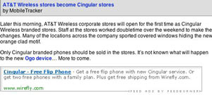Overture is voor deze nieuwe dienst een samenwerkingsverband aangegaan met FeedBurner. Hier een voorbeeld van hoe zo’n advertentie er voor de weblog Mobile Tracker uit ziet.