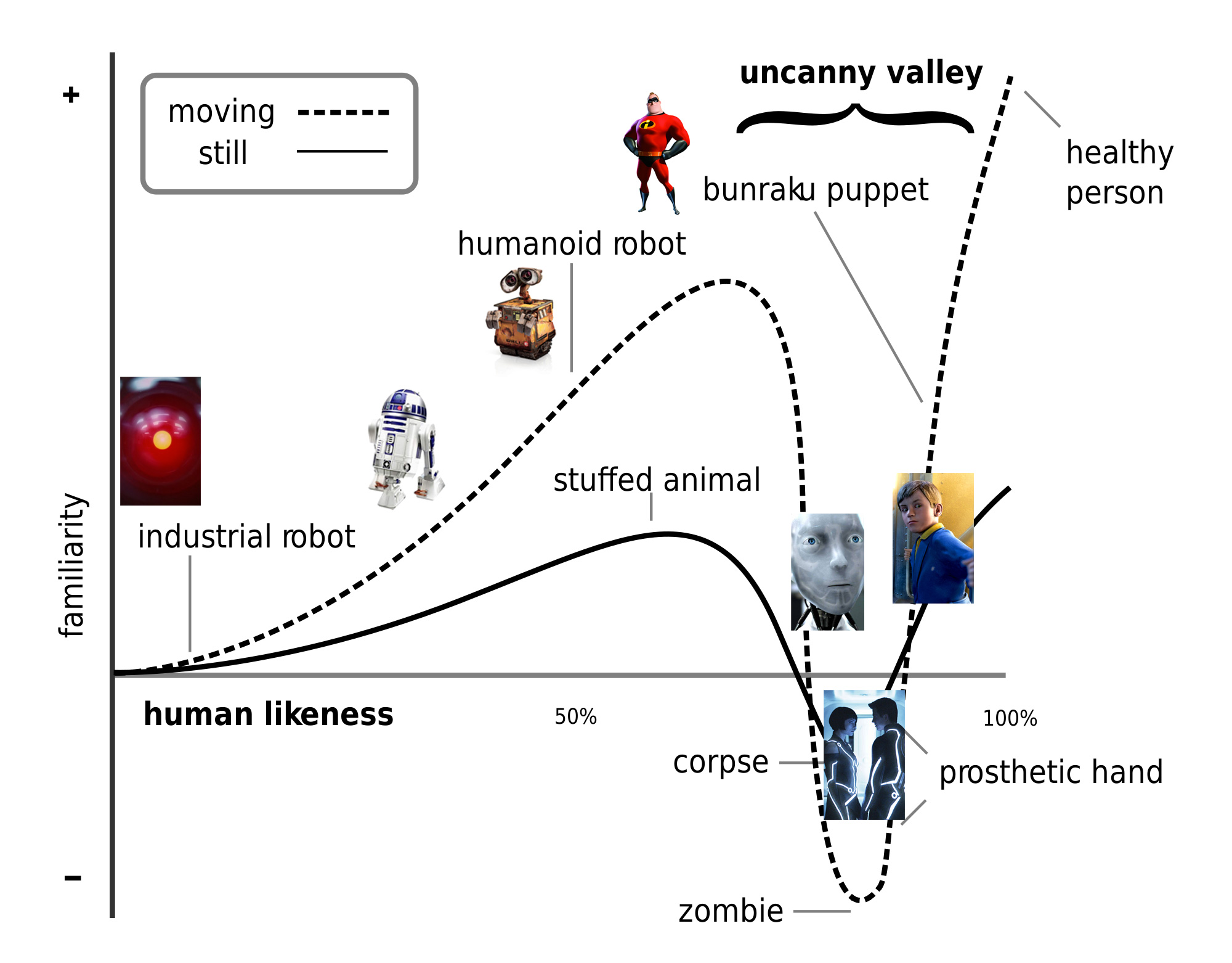 De Japanse robotmaker Masahiro Mori introduceerde het begrip ‘uncanny valley‘ in 1970. Hij kwam erachter dat naarmate de robots die hij ontwikkelde menselijker werden, de emotionele respons van mensen op die robots eerst toenam, maar daarna juist scherp afnam. HAL 9000 roept amper emotie is, omdat het slechts een rode lamp met een stem is. R2-D2 uit Star Wars vertoont al meer menselijke vormen, maar WALL-E doet dat nog veel meer – én werd door miljoenen mensen in de armen gesloten.
