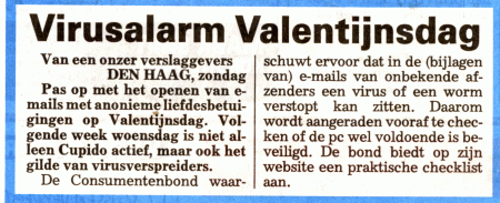 Via verschillende media (nu.nl of telegraaf.nl) waarschuwt de Consumentenbond sinds afgelopen vrijdag om voorzichtig te zijn met anonieme liefdesbetuigingen via e-mail op Valentijnsdag. Dit omdat de afzenders er verkeerde bedoelingen mee hebben. Waarom alleen op Valentijnsdag scherp zijn? Het gevaar van Spoofing is aan de orde van iedere dag. Een voorbeeld van spoofing met slechte bedoelingen is de Bankgiroloterij overkomen dat op haar site daarvoor ook waarschuwt.