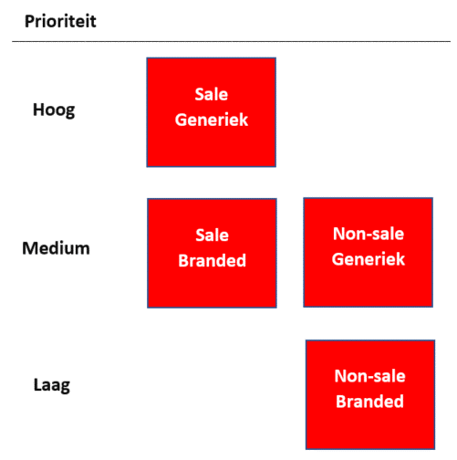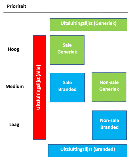 In bovenstaand scenario zullen alle zoektermen getriggerd worden op de generieke variant van de Shopping campagne, deze heeft ten slotte de hoogste prioriteit. Om ervoor te zorgen dat merkgedreven zoektermen wel gewoon in de ‘branded’ campagnetype getriggerd worden, is het belangrijk om negatieve zoekwoorden tussen de campagnes uit te sluiten. Uitsluitingszoekwoorden, ook wel negatieve zoekwoorden genoemd, zijn zoekwoorden of delen van het zoekwoord die je uitsluit om niet vertoond te worden op zoektermen die niet relevant zijn voor geadverteerde producten. In deze situatie wil je deze functie gebruiken om te zorgen dat de zoektermen door de juiste campagne getriggerd worden.