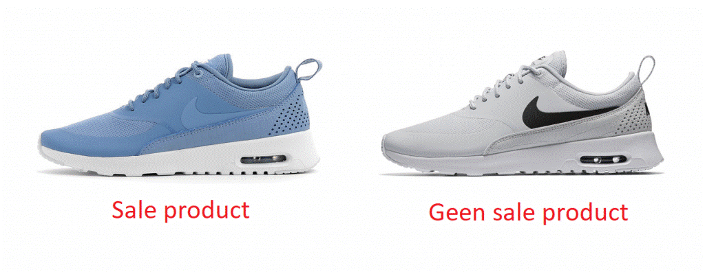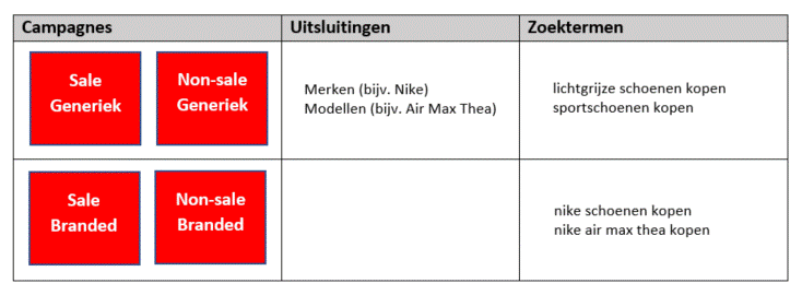 De blauwe schoenen zijn in de sale, terwijl de lichtgrijze schoenen niet in de sale zijn en dus een normale prijs hebben. Als de eerder genoemde prioriteiten meegegeven worden aan campagnes, zou dit ervoor zorgen dat de blauwe sale schoenen eerder of meer vooraan vertoond zou worden dan de lichtgrijze normale prijs schoenen. De blauwe schoenen zouden eerst in de sale generiek campagne vallen, maar omdat de merken in die campagne uitgesloten zijn, valt het in het bakje eronder: de sale branded campagne. Evenals voor de lichtgrijze schoenen zou hij eerst in de non-sale generiek campagne vallen, maar door de uitsluitingen valt hij in de non-sale branded campagne. In de onderstaande tabel is te zien bij welke campagnes uitsluitingen gedaan moeten worden en wat voor zoektermen die campagnes zouden triggeren.