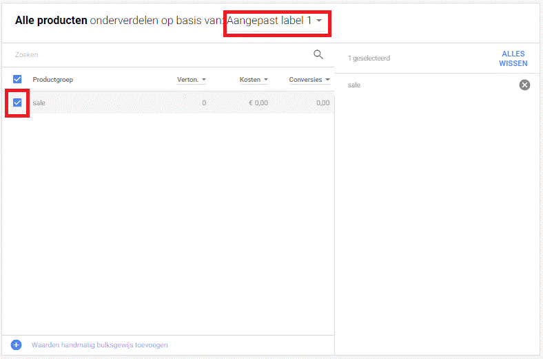Na het aanmaken en vullen van de custom label, zal je in Google Shopping de custom label aan de sale-campagnes moeten toevoegen. Stel, je hebt de splitsing gemaakt met labels en je wilt deze nu doorvoeren in je campagnes. Dan zal je na het aanmaken van de sale campagne de volgende stappen moeten ondernemen: