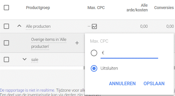 Hierna zijn twee productgroepen te zien, namelijk sale en overige items (alles wat niet bij sale hoort, dus non-sale). In een sale-campagne zouden de overige items uitgesloten moeten worden, zodat alleen sale-producten meegenomen worden. Voor een non-sale campagne zou het tegenovergestelde gedaan moeten worden en wordt de productgroep sale juist uitgesloten.