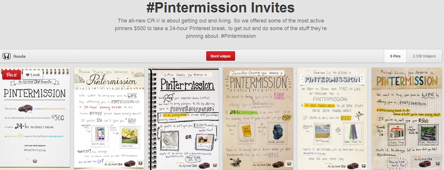 Honda heeft Pinterest heel slim ingezet als marketingtool bij het lanceren van hun nieuwe model auto. Ze gaven een aantal invloedrijke pinners $500,- om een 24-uurs pauze van Pinterest te nemen om een aantal dromen waar ze over pinnen, waar te maken. Uiteraard werd het fotoverslag van deze dag gepind op een speciaal bord op het Honda-account onder de hashtag #Pintermission.