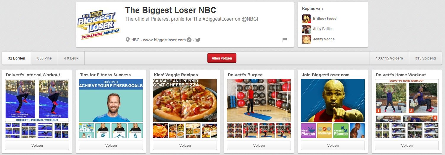 De NBC heeft Pinterest als eerste ingezet als tweede scherm bij hun TV-programma The Biggest Loser. In het programma worden kandidaten gevolgd in hun wedstrijd om op een gezonde manier zo veel mogelijk gewicht kwijt te raken. Op de borden van het account, worden tijdens de uitzending recepten, work-outs, e.d. gepind, die de tv-kijker zelf kan gebruiken.