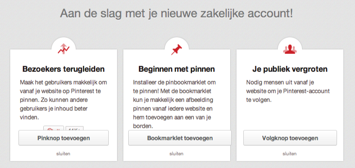 Bij het aanmaken van een Pinterest-account kun je inmiddels kiezen voor een persoonlijk of zakelijk account. Op dit moment zijn de verschillen tussen de twee nauwelijks zichtbaar. Bij een zakelijk account is het mogelijk een bedrijfsnaam in te vullen en een contactpersoon. Op een persoonlijk account zijn een voor- en achternaam vereist. Wel zijn er duidelijke verschillen in de gebruikersvoorwaarden en is er een zeer complete ondersteunende pagina voor bedrijven ingericht met makkelijke toegang vanuit het bedrijfsaccount. Daaruit blijkt wel dat Pinterest druk in de weer is om hun platform aantrekkelijk te maken voor bedrijven.