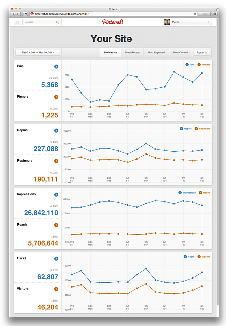 Als je het adres van je website hebt geverifieerd op je Pinterest-account en je in ‘de nieuwe look’ van Pinterest werkt, heb je inmiddels toegang tot de statistieken die Pinterest aanbiedt over het pingedrag vanaf jouw site. Deze statistieken vertellen je alles over wat er van je site gepind wordt. Het aantal pins, hoeveel pinners daarbij betrokken zijn en hoe vaak deze pins gerepind zijn. Je ziet wanneer deze pins geplaatst zijn, hoeveel pinners bereikt zijn en hoeveel bezoeken dat oplevert aan je site. Via het tabblad ‘meest recent’ kun je de exacte pins bekijken. Waardevolle informatie voor elke marketeer.