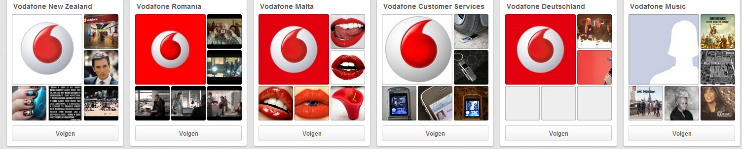 Vodafone is als merk best actief op Pinterest. Diverse landen hebben verschillende accounts. Hierbij plaatsen we direct de opmerking dat het ene land veel actiever is dan het andere. Dit komt het geheel aan activiteiten van Vodafone niet ten goede.