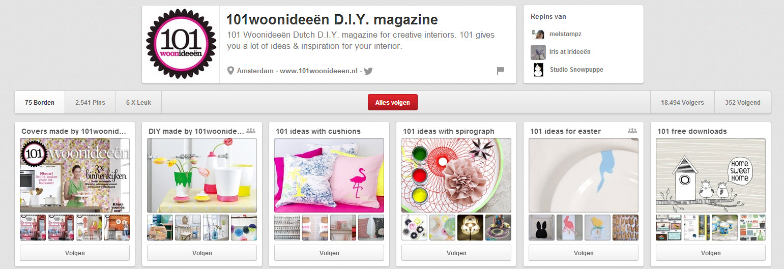 Met ruim 18.000 volgers is 101 Woonideeën een van de grootste Nederlandse zakelijke accounts op Pinterest. Ze geven volop suggesties voor je interieur. Hun borden mag je voor de doelgroep inspiratievol noemen. Ze noemen hun borden ook 101……. met daarna de groep erachter waar het over gaat.