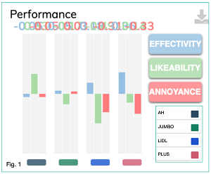 Hoezeer zeggen en denken van elkaar verschillen, blijkt uit de vergelijking met het onderzoek dat in opdracht van Adformatie is uitgevoerd onder het ‘grote publiek’. Als je aan mensen vraagt wat de beste commercial is dan zegt men op 1, 2 en 3 respectievelijk Jumbo, Lidl en Plus. Als je de dezelfde doelgroep in hun brein kijkt, is de volgorde Plus, Lidl, Jumbo. Althans wanneer het om effectiviteit gaat. Kijken we naar waardering of het betere Engelse begrip ‘likability’ dan steekt Albert Heijn er met kop en schouders bovenuit. In de benchmark-analyse (fig.1) zien we de correlatie die de 4 TVC’s hebben met de benchmarks. Jumbo scoort als een gemiddelde reclame terwijl Plus -en Lidl als goede tweede- sterk correleert met Effies. AH is de enige die meer dan gemiddeld en zeer hoog scoort op likability.