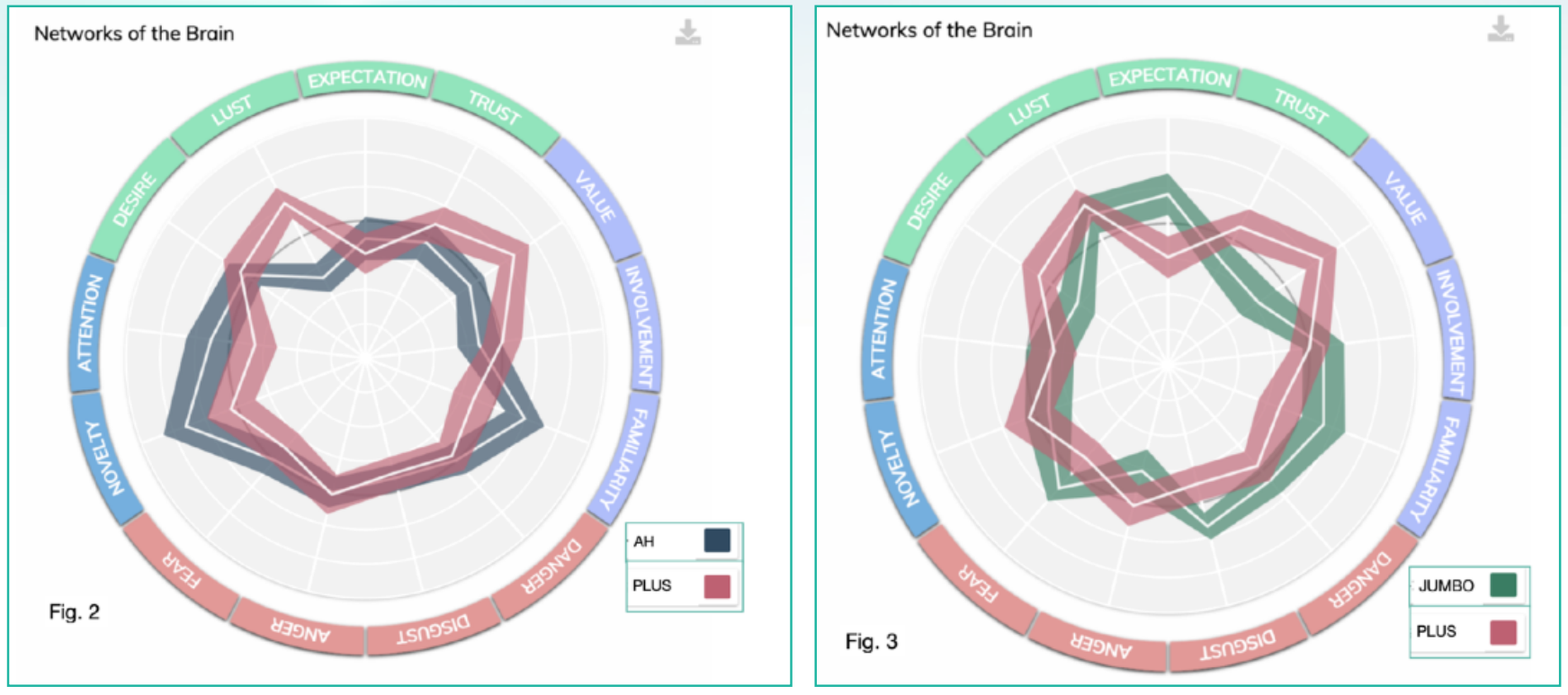 De sleutel tot het succes in de commercial van Plus lijkt de wederkerigheid te zijn. Kuddedieren als wij mensen zijn, is wederkerigheid een bijzonder sterk affect. In fig. 2 zien we de vergelijking van Plus en AH in de activatie van de afzonderlijke emoties. De witruimte tussen de beide metingen laat de significante verschillen zien. De Plus-commercial hier in het rood scoort overtuigend beter in waarde (Value) en verlangen (Lust). Vergelijken we Plus met Jumbo dan zien we dat deze laatste significant sterker scoort op afkeer (Disgust) en ook wat meer gevaar activeert (Danger). Ervaring met de interpretatie van recente TV-commercials leert dat het zien van een grote groep mensen bij elkaar in deze tijd van de corona-angst als onprettig wordt ervaren.