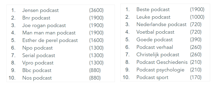 Ook in de zoekvolumes komt duidelijk naar voren dat termen als ‘beste podcast’, ‘leuke podcast’ of ‘Nederlandse podcast’ steeds vaker worden gebruikt, maar branded podcasts als ‘Jensen podcast’ en ‘BNR podcast’ hebben een nog veel groter zoekvolume. De zoekintentie van de gebruiker begint langzaam te veranderen en steeds meer te focussen op niches binnen podcasting. Binnen de zoekresultaten van Google zijn voornamelijk termen met ‘podcast’ erin die de podcastfeature van Google genereren.