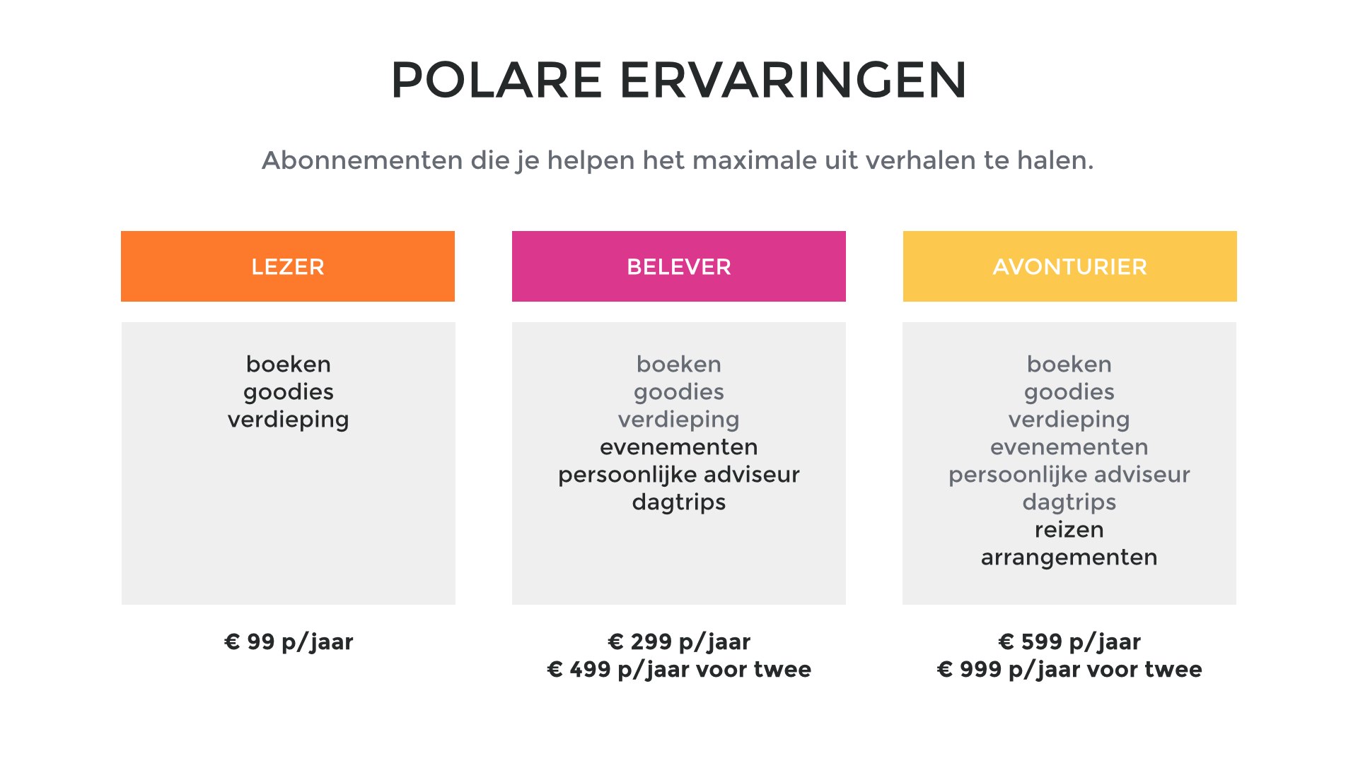 Daarnaast worden er ‘Polare Ervaringen’ aangekondigd, abonnementen oplopend tot 999 euro voor twee personen per jaar, die lezers moeten helpen het maximale uit verhalen te halen. Via Twitter en Facebook verspreidt het nieuws zich razendsnel. Wanneer het bericht door een aantal bekende Nederlanders wordt opgepakt, stromen de reacties via de contactpagina binnen. Journalisten willen weten wie er achter dit initiatief zit, mensen in het boekenvak zijn verrast en vele lezers reageren ronduit enthousiast op de plannen. Tientallen geïnteresseerden zullen zich uiteindelijk aanmelden voor een abonnement.