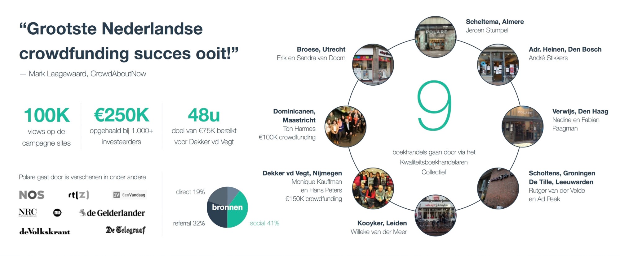 In Nijmegen weet voormalig Dekker v/d Vegt in één weekend 75.000 euro op te halen en dit bedrag binnen een week zelfs te verdubbelen. De Dominicanenkerk in Maastricht, geroemd als een van de mooiste boekhandels ter wereld, bereikt binnen zeven dagen het maximumbedrag van 100.000 euro. In totaal wordt in korte tijd 250.000 euro opgehaald bij meer dan 1.000 individuele investeerders. Volgens Mark Laagewaard, directeur en eigenaar van CrowdAboutNow, is de opgezette actie de meest succesvolle crowdfundingcampagne in Nederland ooit.